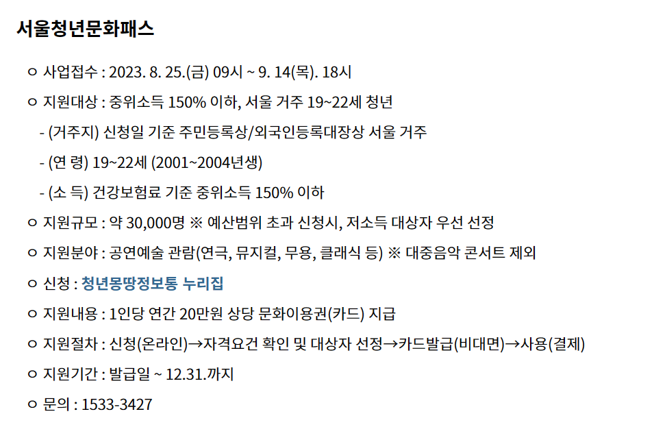 ▶ 서울시는 서울 거주 청년들에게 연 20만 원의 문화이용권을 지원하는 ‘서울청년문화패스’ 하반기 참여자를 8월 25일~9월 14일 모집합니다.