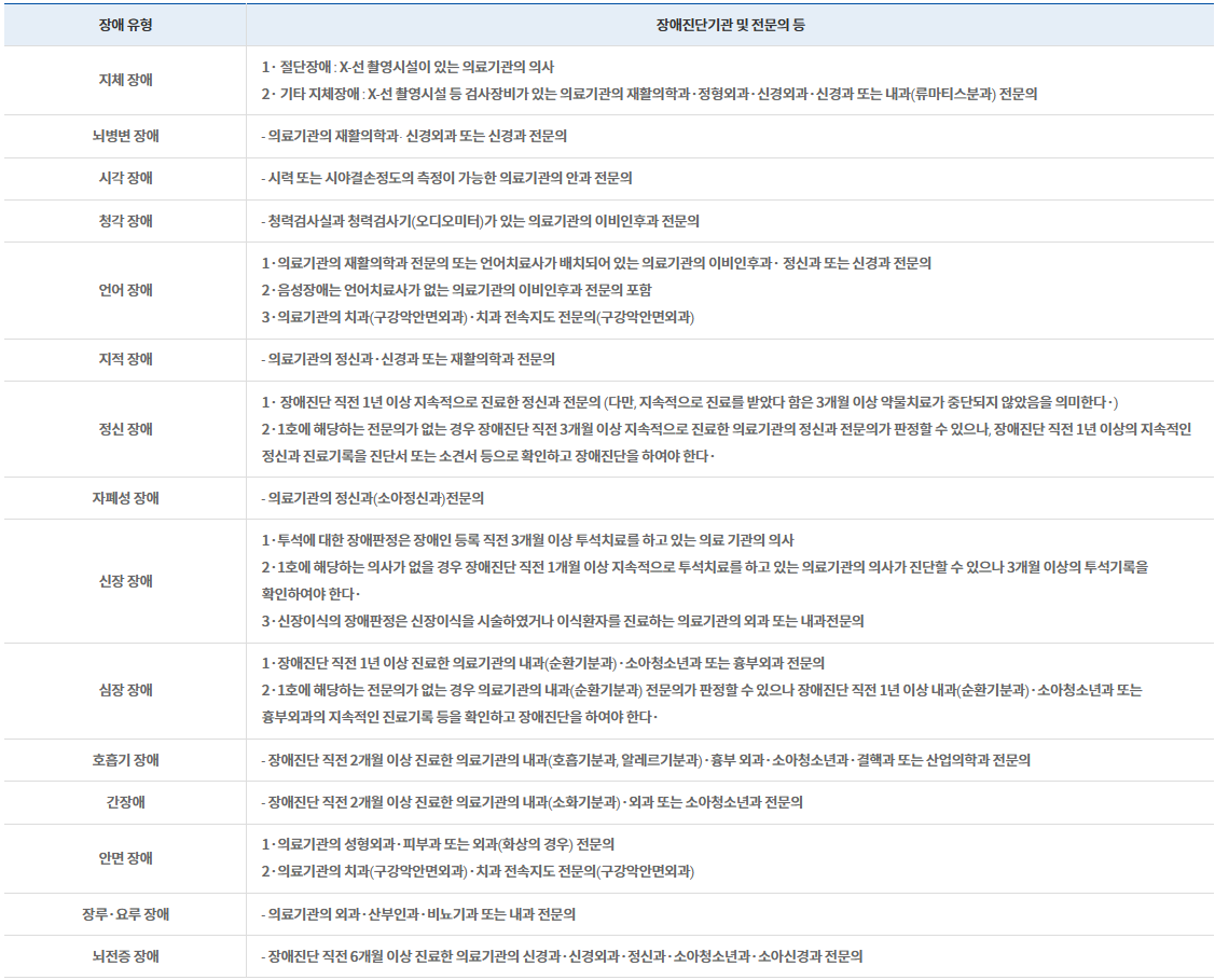 - 신청인은 의료기관의 전문의사로부터 장애진단 및 검사를 통해 장애진단서를 발급 받고, 장애유형별 필수 구비서류를 갖추어 주소지 관할 읍 · 면 · 동 주민센터에 제출