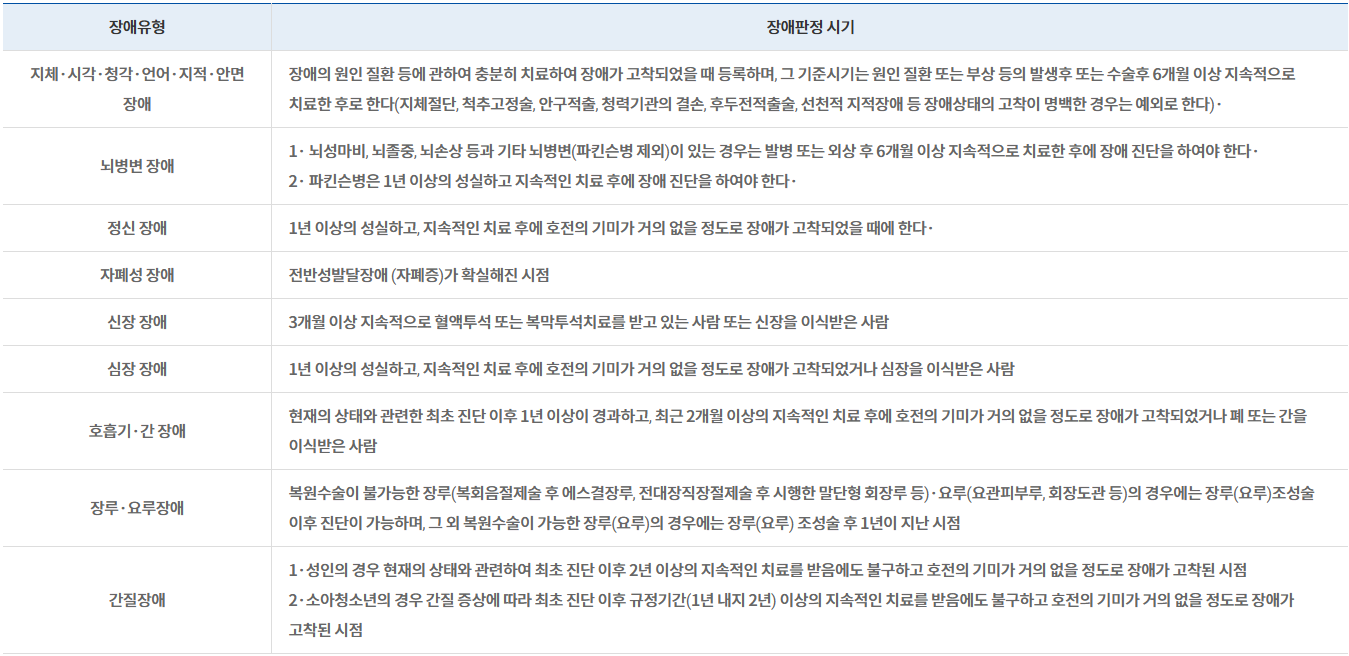 불가피한 이유로 장애인이 되신 분들을 위해 나라에서는 장애인들을 위한 많은 복지혜택이 있는데요. 장애인 등록 신청절차는 어떻게 하는지 장애유형별 장애판정시기는 어느 시점에 이루어지는지 아래에서 자세하게 살펴보겠습니다.