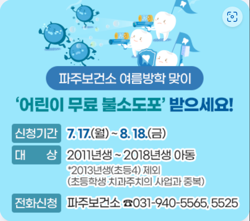 파주시에 사는 어린이분들 충치 예방을 위한 '어린이 무료 불소도포'를 시행하니 파주시 보건소에서 치아 불소도포받으세요.
